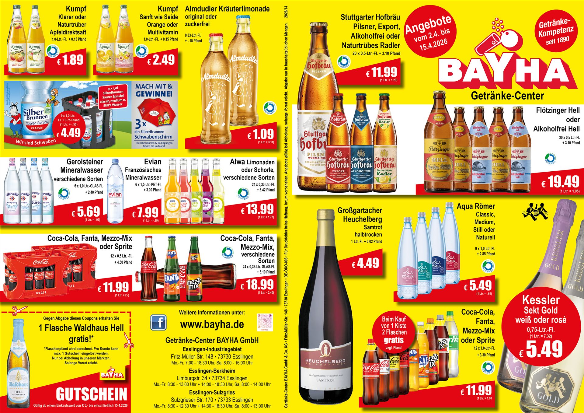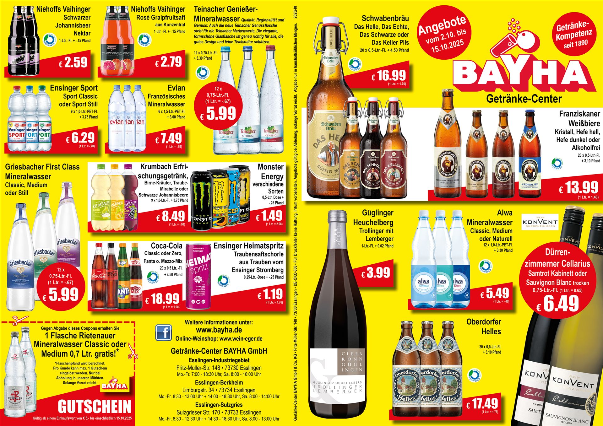 Getränke-Center BAYHA GmbH & Co. KG | Fritz-Müller-Str. 148 | 73730 Esslingen | Telefon: 0711 93920710 | Fax: 0711 93920722 | E-Mail info@bayha.de | Öffnungszeiten